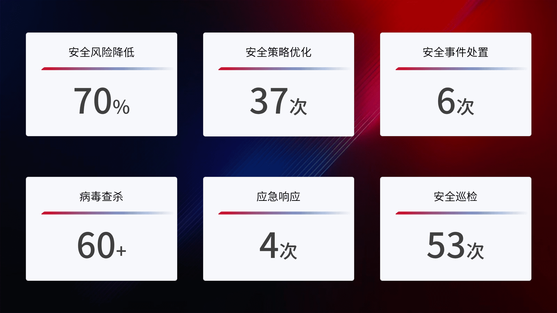 提供全面的安全事件报告体系,,,包括处置报告、、、、周报、、季度和年度总结,,,,结合持续监控,,,,帮助客户深入了解网络安全状况。。。。